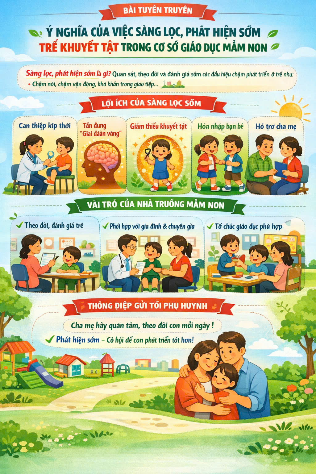 Cha mẹ hãy luôn quan tâm, theo dõi sự phát triển của con; mạnh dạn trao đổi với giáo viên khi nhận thấy dấu hiệu bất thường. Việc phát hiện sớm không phải để lo lắng, mà là cơ hội để giúp con phát triển tốt hơn mỗi ngày.
